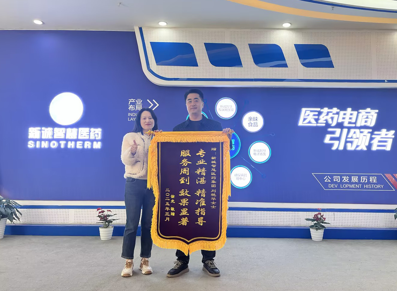 今年的3月份,糖友徐先生,从老家四川成都金堂县,不远千里专程到了新诚智慧医药集团总部,只为送一面感谢的锦旗,锦旗上写到”专业精湛、精准指导、服务周到”。