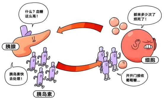 但这些“坏信号”会让胰岛素这把“钥匙”变得不好用,细胞的“血糖大门”打不开,葡萄糖进不去细胞,从而大量的葡萄糖堆积在血液当中,升高血糖浓度。升高的血糖浓度会继续刺激胰岛β细胞大量分泌胰岛素。此时胰岛β细胞处于超负荷工作状态,这种情况如果长期得不到改善,时间一长,超负荷的胰岛β细胞就容易凋亡,从而进展成为糖尿病。这也就是为什么都说肥胖是2型糖尿病的后备军的原因。